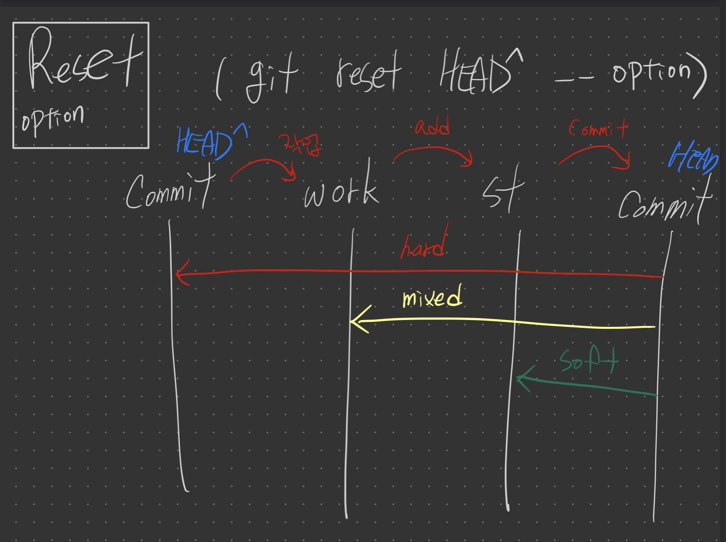 - 현재 커밋에서 이전 커밋으로 reset (git reset HEAD^ --option)